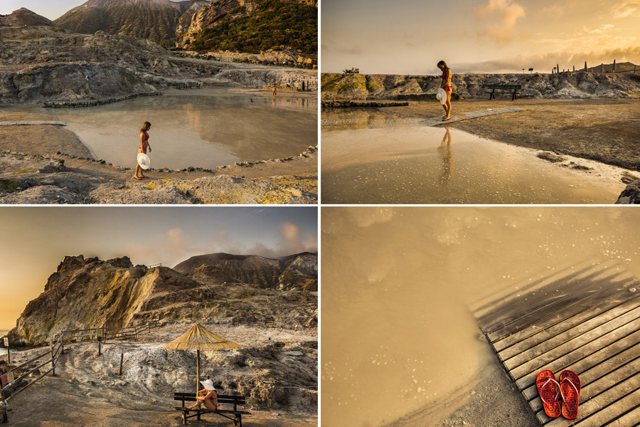 Un descanso termal al aire libre. Así se presenta la conocida Pozza dei Fanghi en la isla de Vulcano. Este lugar, a poca distancia del puerto, es un lago de agua tibia de manantial alimentado naturalmente. De unos cincuenta centímetros de profundidad, la piscina alcanza los treinta y cuatro grados y es una auténtica panacea en primavera y otoño, cuando incluso es agradable sumergirse por completo, mientras que en verano es recomendable, dada la ya alta temperatura ambiente, mojarse durante las primeras horas de la mañana o al final de la tarde.